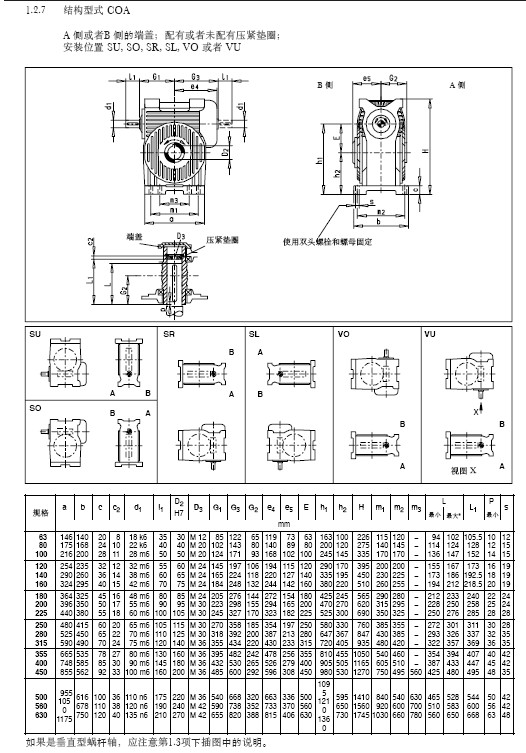 COA蝸輪蝸桿減速機(jī)安裝形式為蝸桿上置式,蝸輪為孔輸出。傳動比多樣,中心距63-630mm,具體中心距分一下幾種: