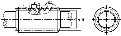 蝸桿一般選用一個視圖,其齒頂線、齒根線和分度線的畫法與圓柱齒輪相同,如下圖所示。圖中以細實線表示的齒根線也可省略。齒形可用局部剖視或局部放大圖表示。 |