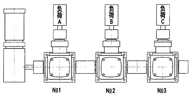 ※1號減速器 因1號減速器本身的負載為245N·m,而2、3號減速器需通過1號減速器傳遞扭矩。所以1號減速器應承擔的負載為:245N·m+245N·m+245N·m=735N·m,依據傳動能力表,應選AT12。