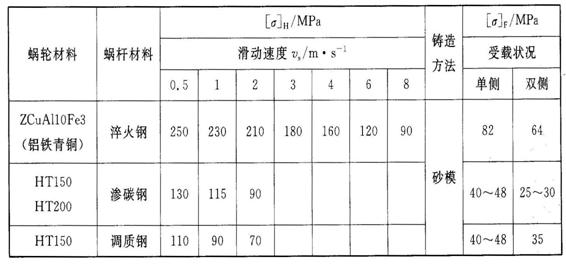 2、蝸輪材料及許用應力 錫青銅:減摩性、耐磨性好,抗膠合能力強,但價格高,用于相對滑動速度vs≤25m/s的高速重要蝸桿傳動中; 鑄鋁青銅:強度好、耐沖擊而且價格便宜,但抗膠合能力和耐磨性不如錫青銅,一般用于vs ≤10m/s的蝸桿傳動中; 灰鑄鐵:用于vs ≤2m/s的低速、輕載、不重要的蝸桿傳動中。
