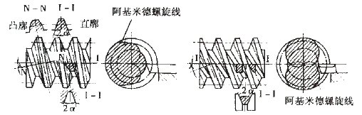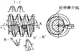 圖1所示為幾種蝸桿的車削方法,其中圖(a)、(c)所示為阿基米德(ZA)蝸桿和漸開線(ZI)蝸桿。當(dāng)蝸桿的頭數(shù)增多、導(dǎo)程角增大時(shí),其幾何形狀和切削角度將出現(xiàn)加工困難。圖(b)所示為一種延伸漸開線蝸桿,又稱齒槽法向直廓(ZN